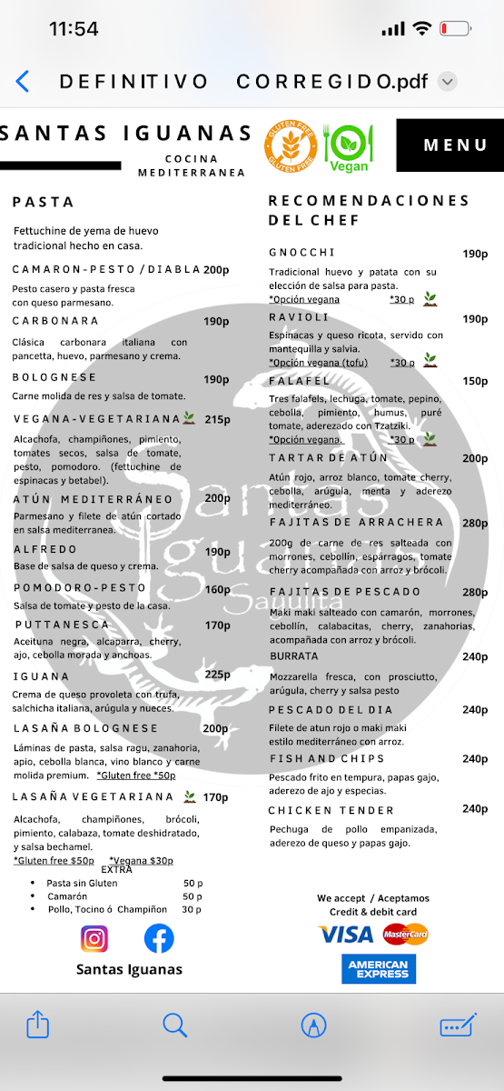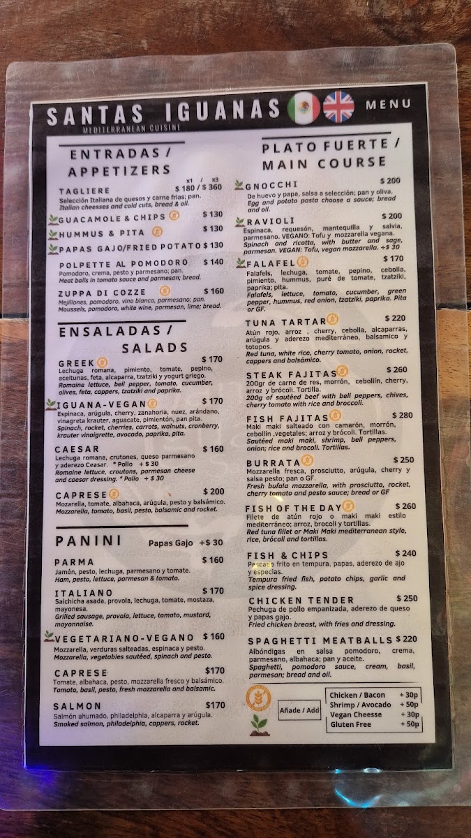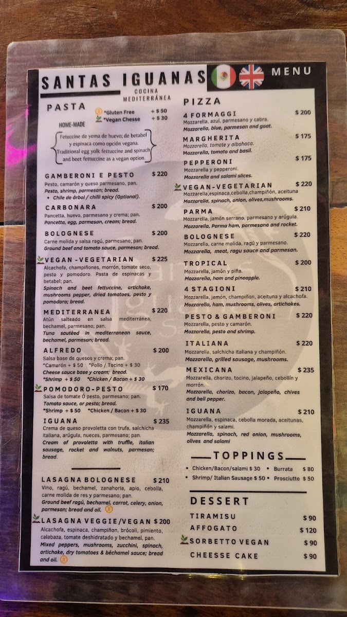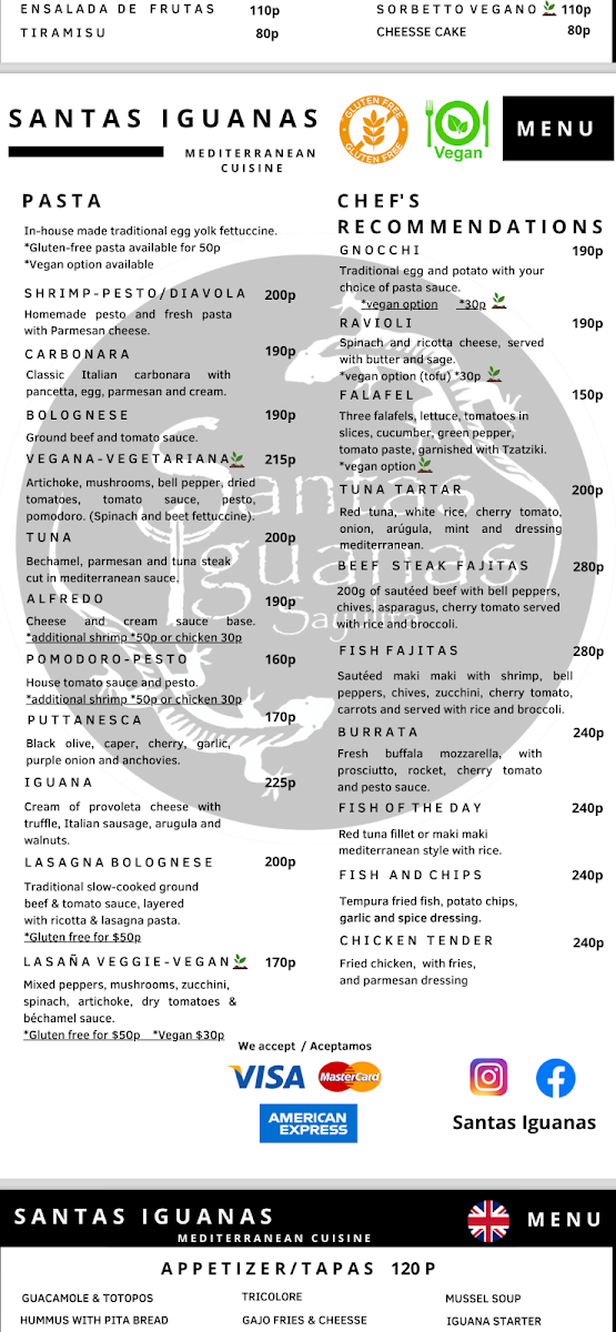 Welcome to Santas Iguanas, a vibrant oasis in Sayulita, Mexico, where the flavors of Italy come to life. This charming restaurant, created by two Italian transplants from Torino, offers an array of authentic pastas and delightful dishes inspired by Mediterranean cuisine. Highlighting homemade offerings, try the exquisite Pasta Carbonara, rich with creamy sauce and savory bacon, or the Ravioli filled with spinach and ricotta, paired with aromatic sage butter. For a vegan twist, indulge in the flavorful Pasta Pesto or the traditional gnocchi, served with your choice of sauce. The chef's Falafel Salad, topped with refreshing Tzatziki, has garnered rave reviews for its freshness and flavor. Patrons appreciate the welcoming atmosphere and attentive service, making Santas Iguanas a must-visit for anyone craving a memorable culinary experience filled with warmth and authenticity. Don't forget to explore their delightful drinks menu to complete your meal!
